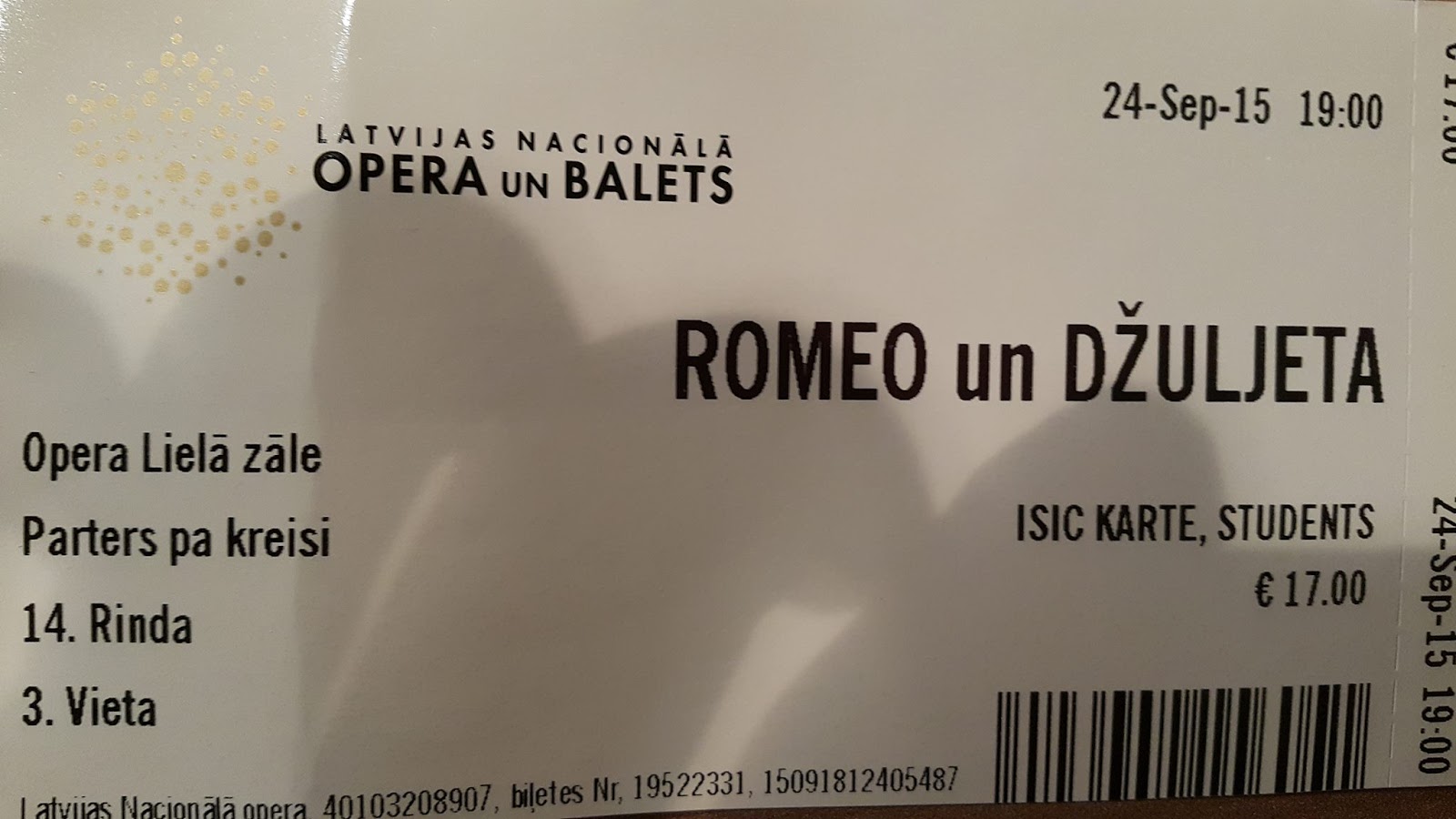 兩周前一位同學邀大家去看芭雷舞。據這位同學說,羅密歐與茱麗葉是芭雷舞特別難演,因為有很多武打場面,blablabla,九月又只有這一場,一定要把握機會。總之大家都被她說服了,紛紛到歌劇院買票。據常看歌劇或是芭雷舞的同學表示,二十元的票價是算便宜的。